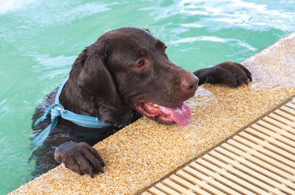 When your family is swimming with the dog he will be under close watch. But what about the times when he’s in the backyard alone. If he is a large dog and it is hot the pool might be too tempting for him. To help assure his safety stair training is a must. This can be a fun time for you and your pet. There should be at least two people involved, one in the pool and one out of the pool. Start with the dog outside the pool. Give the dog his favorite treat. Then let the dog get in the pool with the second person and keep him near the stairs. Now the person on the cool deck should show the dog the treat and entice him to climb the stairs out of the water to get the treat. Give him lots of praise. Every few times start the dog a little farther away from the stairs so he has to swim to it. Continue to do this exercise over and over until he’s confident about using the pool stairs.